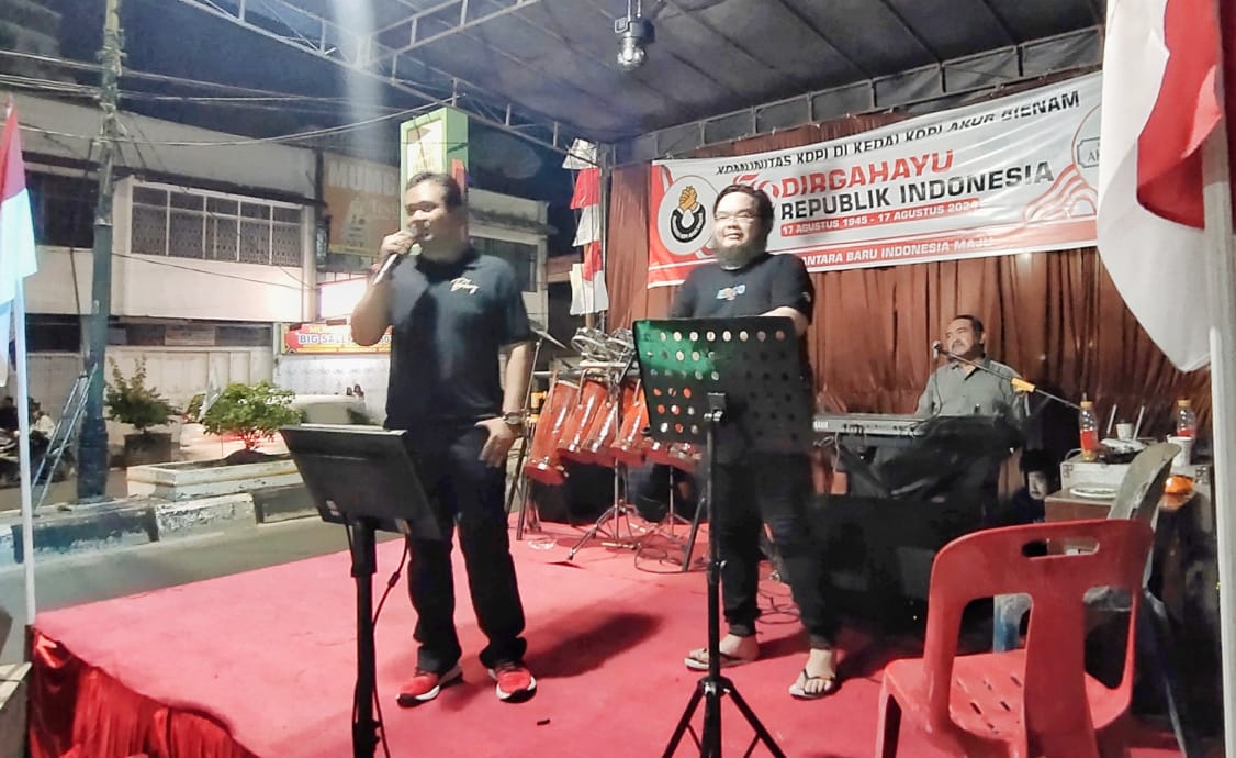 Katapublik Labuhanbatu, Sejumlah penikmat kopi di Kedai Kopi dan Roti Akur Bienam Since 1896 Rantauprapat, Labuhanbatu menggelar malam HUT Kemerdekaan ke-79 RI, Minggu (19/8/2024) malam.