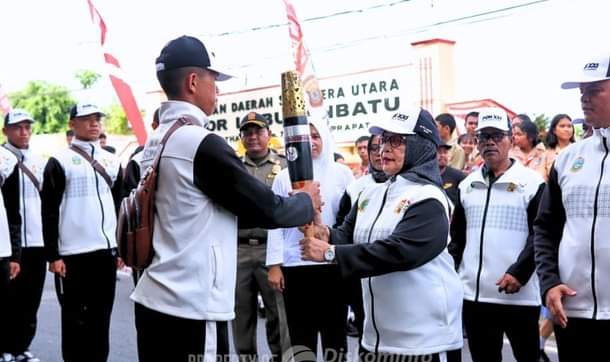 Katapublik Labuhanbatu, Kirab Api Pekan Olahraga Nasional (PON) ke-21 Aceh-Sumatera Utara Tahun 2024 tiba di Kabupaten Labuhanbatu di terima langsung oleh Plt. Bupati Labuhanbatu Hj. Ellya Rosa Siregar, S.Pd, MM, di Lapangan Ika Bina Rantauprapat, Jumat 06/09/2024.